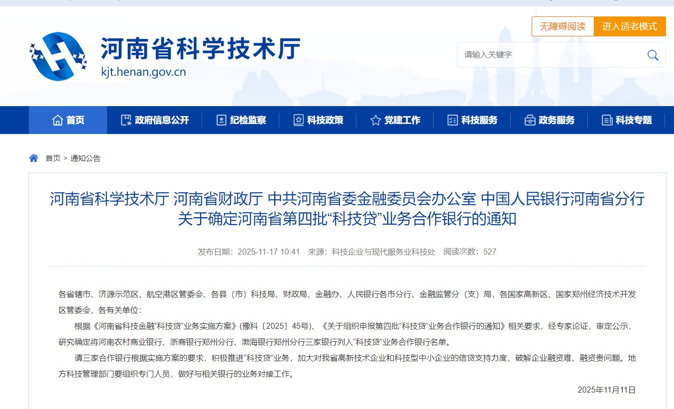 大河网讯 11月17日,记者从河南省科学技术厅获悉,河南省第四批“科技贷”业务合作银行名单确定,经专家论证、审定公示,最终确定将河南农村商业银行、浙商银行郑州分行、渤海银行郑州分行三家银行列入名单。